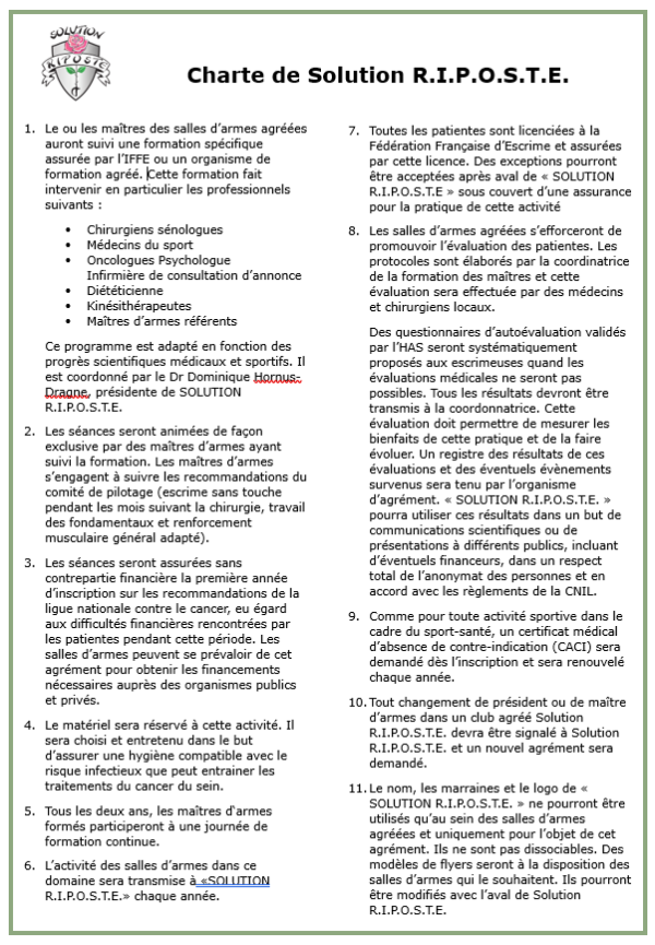 Témoignage du cadre technique d’Etat « Escrime » des Pays de la Loire : Missionné auprès du comité régional d’escrime (échelon régional de la fédération française d’escrime), le cadre technique d’Etat « escrime » des Pays de la Loire a déployé le programme « Solution R.I.P.O.S.T.E » et propose des créneaux dédiés pour les patientes touchées par un cancer du sein.